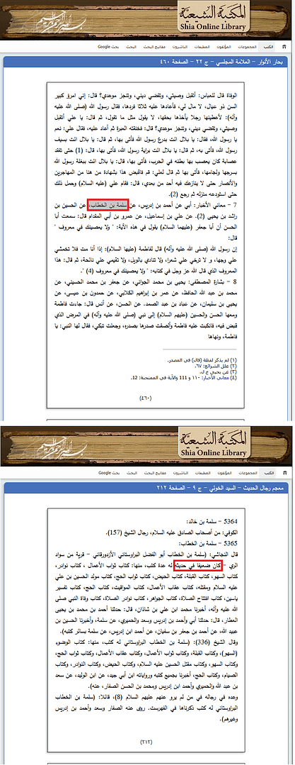 قال النجاشي: (سلمة بن الخطاب أبو الفضل البراوستاني الأزدورقاني – قرية من سواد الري – كان ضعيفا في حديثه له عدة كتب، منها: كتاب ثواب الأعمال ، كتاب نوادر، كتاب السهو، كتاب القبلة، كتاب الحيض، كتاب ثواب الحج، كتاب مولد الحسين بن علي عليه السلام ومقتله، كتاب عقاب الأعمال، كتاب المواقيت، كتاب الحج، كتاب تفسير ياسين، كتاب افتتاح الصلاة، كتاب الجواهر، كتاب نوادر الصلاة، كتاب وفاة النبي صلى الله عليه وآله، أخبرنا محمد ابن علي بن شاذان، قال: حدثنا أحمد بن محمد بن يحيى العطار، قال: حدثنا أبي وأحمد بن إدريس وسعد والحميري، عن سلمة، وأخبرنا الحسين بن عبيد الله، عن أحمد بن جعفر بن سفيان، عن أحمد ابن إدريس، عن سلمة بسائر كتبه).